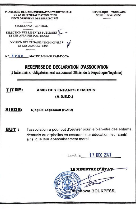 Après avoir été témoin des difficultés rencontrées par certains enfants défavorisées de son pays le Togo, elle a décidé d’agir en étant à l’initiative de la mise sur pied de l’association ADED qui a pour but d’œuvrer pour le bien-être des enfants démunis ou orphelins en assurant leur éducation, leur santé ainsi que leur épanouissement moral.